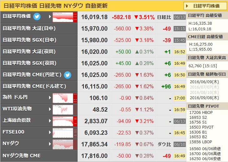 海外市場でブレグジット(英国のEU離脱)リスクが織り込まれ、株式や為替などの各市場がリンクする形でリスクオフに押し流されている。日本株のポートフォリオを減らすというよりも先物をベースに取引をする投資家が先行きの変動リスクを避けるためにポジションを落としているという印象だ。23日のEU離脱をめぐる英国民投票を通過するまでは株価が上昇することは難しく、節目の1万6000円前後を維持できるかが目先のテクニカルのポイントとなる。