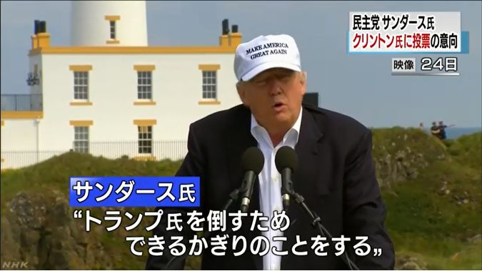 サンダース氏は24日、テレビ番組で本選でクリントン氏に投票するか問われ、「投票する。トランプ氏を打ち負かすために何でもする」と明言。サンダース氏支持者に対しては、クリントン氏のほか、トランプ氏や緑の党のステイン氏も自身に投票するよう呼びかけており、サンダース氏の発言がクリントン氏に有利に働きそうだ。