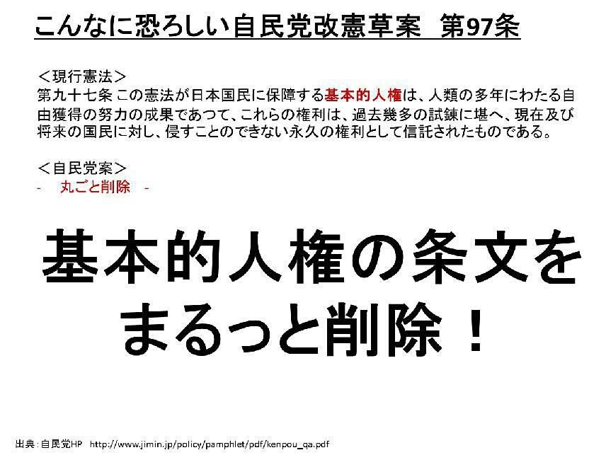 現行憲法下では思想信条は自由 でも憲法を変え、一定の思想信条を他の国民に強制したり、反対する人を逮捕して拷問するようなそんな時代にしないで欲しいわけです。