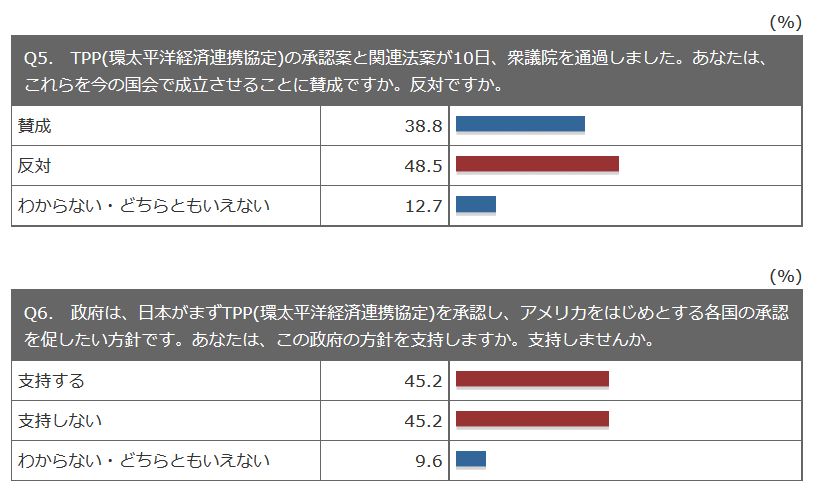 TPP=環太平洋パートナーシップ協定を、今の国会で承認することへの賛否を聞いたところ、「賛成」が18%、「反対」が24%、「どちらともいえない」が48%でした。
