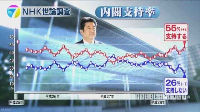 NHK世論調査 内閣支持率、また上がって55%。不支持は、26%まで落ちる