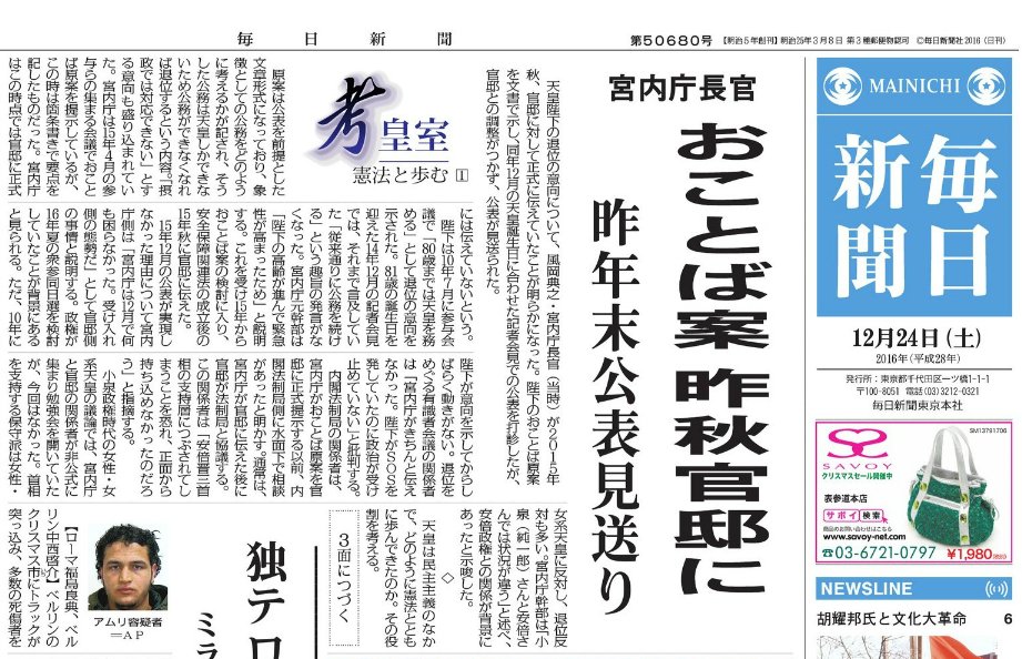 きょう12月24日の毎日新聞が一面トップで大スクープを書いた。8月に発表された天皇陛下のお言葉は、その案がなんと昨年(2015年)秋には官邸に伝えられていたというのだ。ところが官邸が動かなかったというのだ。https://t.co/FeQ1uOEzgb pic.twitter.com/vE2AklEQQm