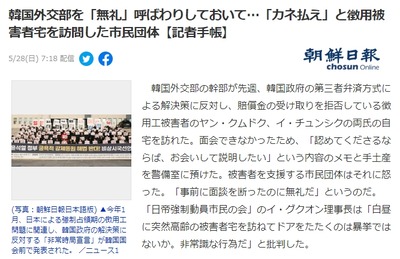 韓国外交部の幹部が先週、韓国政府の第三者弁済方式による解決策に反対し、賠償金の受け取りを拒否している徴用工被害者のヤン・クムドク、イ・チュンシクの両氏の自宅を訪れた。面会できなかったため、「認めてくださるならば、お会いして説明したい」という内容のメモと手土産を警備室に預けた。被害者を支援する市民団体はそれに怒った。「事前に面談を断ったのに無礼だ」というのだ。「日帝強制動員市民の会」のイ・グクオン理事長は「白昼に突然高齢の被害者宅を訪ねてドアをたたくのは暴挙ではないか。非常識な行為だ」と批判した。