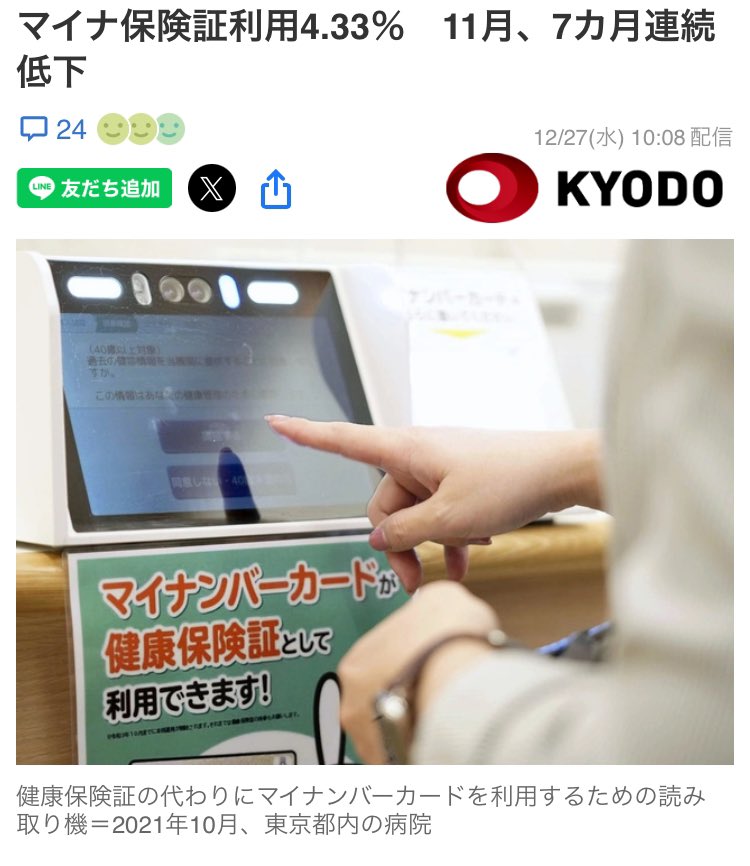 マイナ保険証利用4.33% 11月、7カ月連続低下