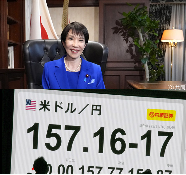 高市政権にとって初の総合経済対策が21日閣議決定。高市首相は喫緊の課題として物価高対応を掲げるが、その要因となる円安は加速の一途だ。11月20日も一時1ドル=157円台後半と約10カ月ぶりの安値をつけた。