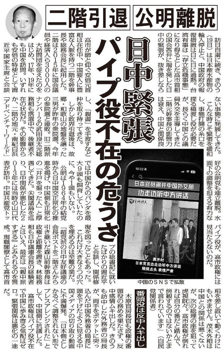 こんな時こそ緊張を緩和し、事態打開の糸口を探る橋渡し役が必要だが、長らく中国との議員外交を主導してきた二階元幹事長の影響力は衰え、中国と関係良好の公明党も連立離脱。水面下の調整を担える有力なパイプ役が、高市政権には見当たらないのだ。