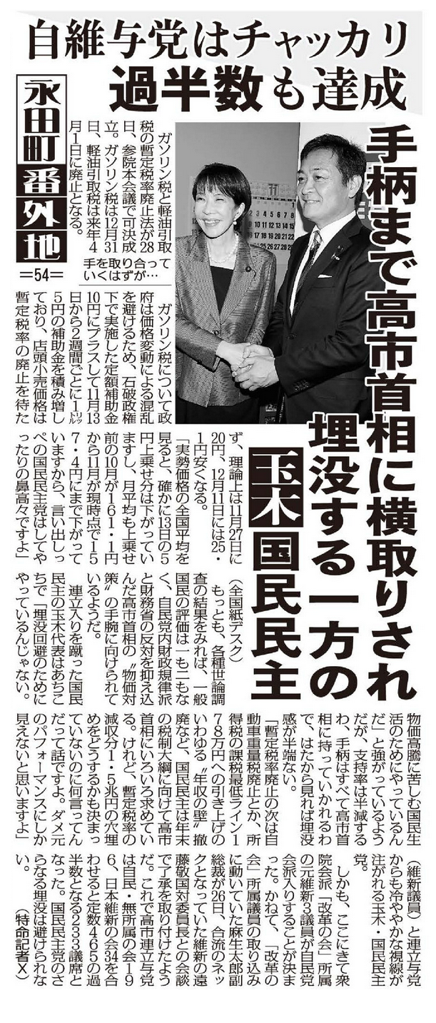 連立入りを蹴った国民民主の玉木代表はあちこちで「埋没回避のためにやっているんじゃない。物価高騰に苦しむ国民生活のためにやっているんだ」と強がっているようだが、支持率は半減するわ、手柄はすべて高市首相に持っていかれるわで、はたから見れば埋没感が半端ない。