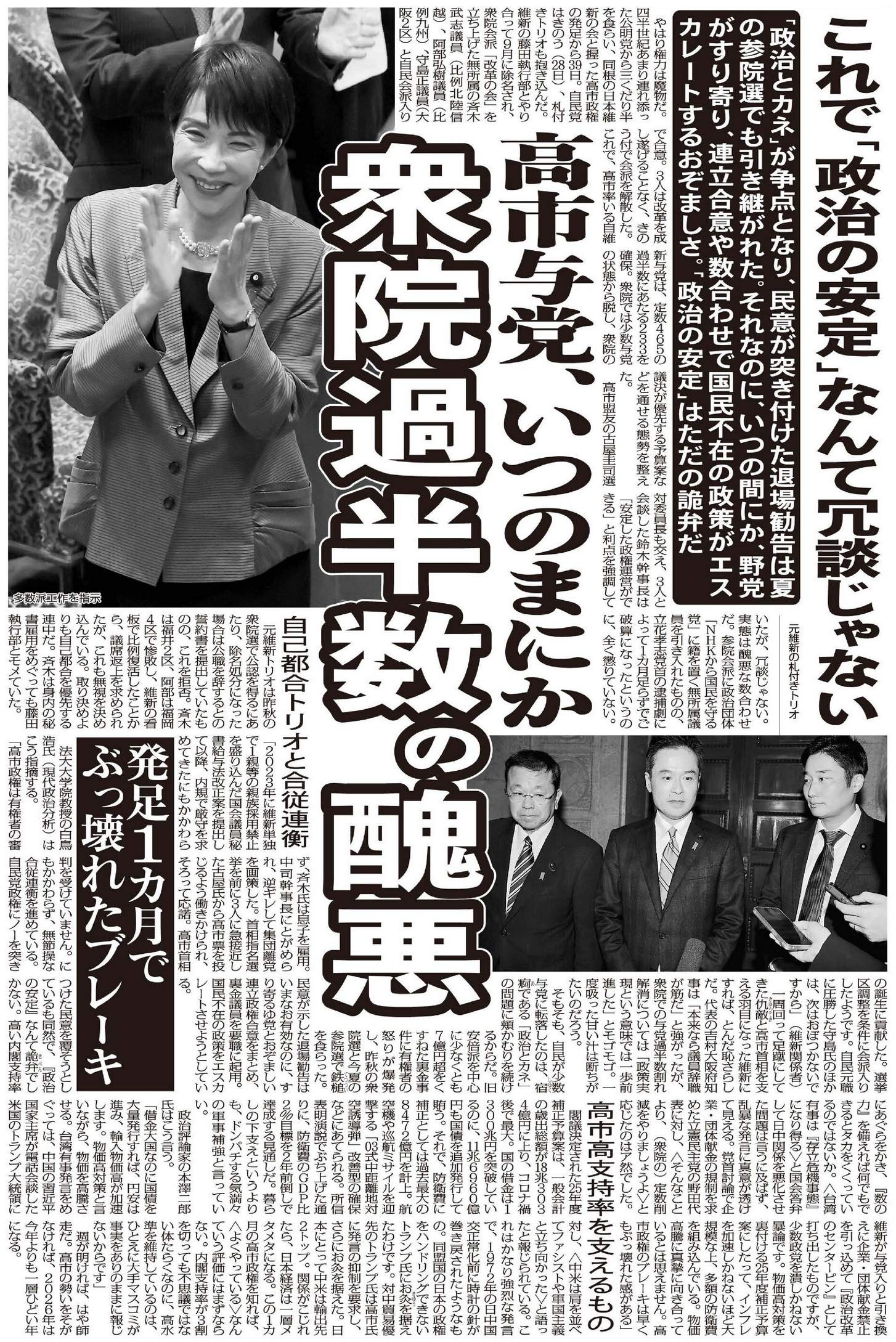 一周回って足蹴にしてきた仇敵と高市首相を支える羽目になった維新にすれば、とんだ恥さらしだ。代表の吉村大阪府知事は「本来なら議員辞職が筋だ」と強がったが、衆院での与党過半数割れ解消については「政策実現という意味では一歩前進した」とモゴモゴ。一度吸った甘い汁は断ちがたいのだろう。