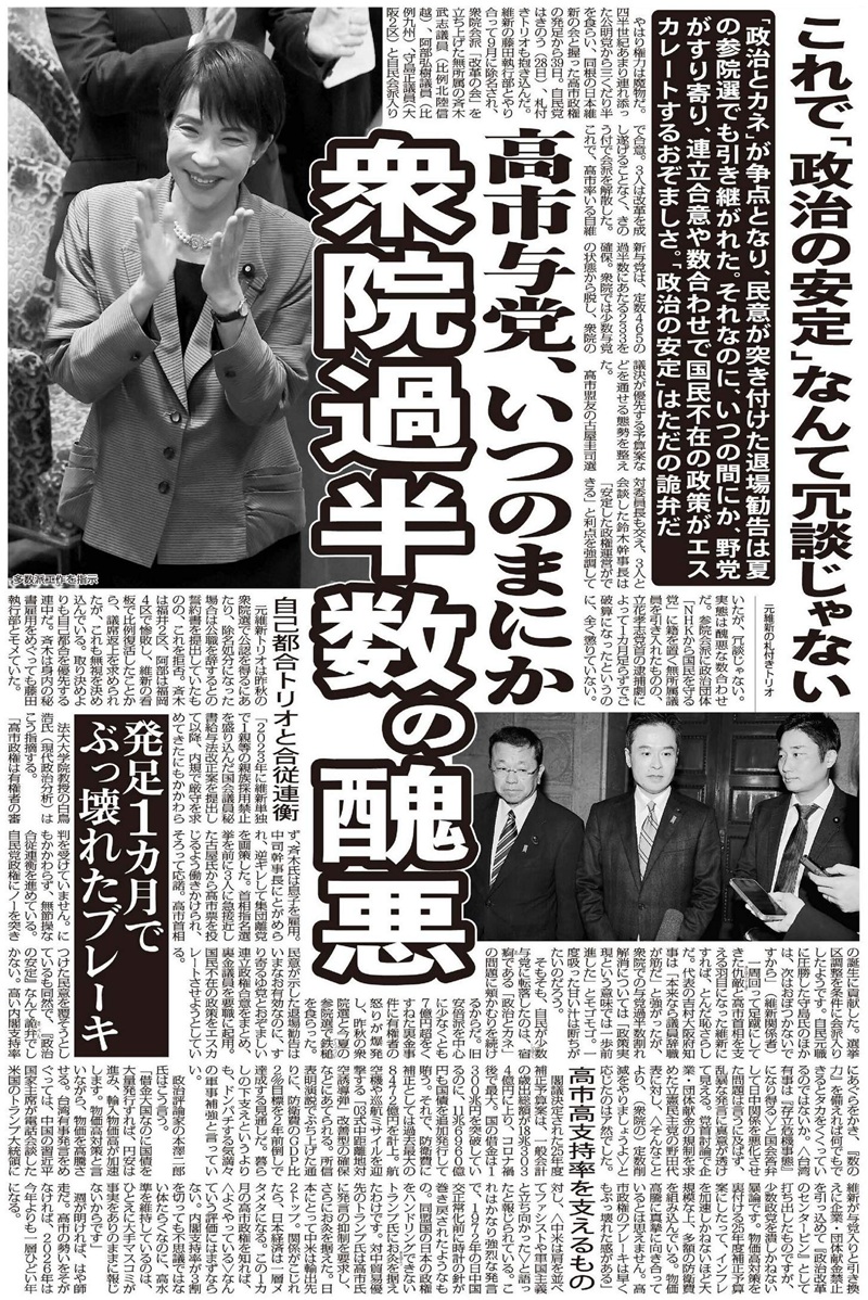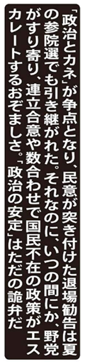 「政治とカネ」が争点となり、民意が突き付けた退場勧告は夏の参院選でも引き継がれた。それなのに、いつの間にか野党がすり寄り、連立合意や数合わせで国民不在の政策がエスカレートするおぞましさ。「政治の安定」はただの詭弁だ。